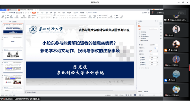 2022年8月10日上午9:00,东北财经大学EMC易倍官方网站副经理陈克兢,以线上腾讯会议的形式为公司EMC易倍官方网站作题为“小股东参与能缓解投资者的信息劣势吗?兼论学术论文写作、投稿与修改”的学术报告。本次会议由EMC易倍官方网站经理梁毕明主持,EMC易倍官方网站教师、暑期实证研究方法与论文写作集训营学员及会计学术型硕士研究生参加了报告会。本次报告,陈克兢教授围绕公司治理中,中小股东与大股东利益冲突的研究发现,由于公司中小股东专业能力不...