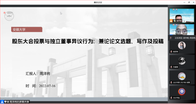 7月16日上午8:30,安徽大学商公司副经理、二级教授、博士生导师、EMC易倍官方网站2001级优秀员工周泽将教授,以线上腾讯会议的形式为公司做题为“股东大会投票与独立董事异议行为:兼论文选题、写作及投稿”的学术报告。本次会议由EMC易倍官方网站经理梁毕明主持,EMC易倍官方网站教师、暑期实证研究方法与论文写作集训营学员及会计学术型硕士研究生参加了会议。本次报告共分两部分:一是以周泽将教授学术成果:股东大会投...
