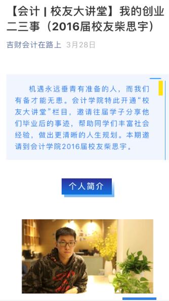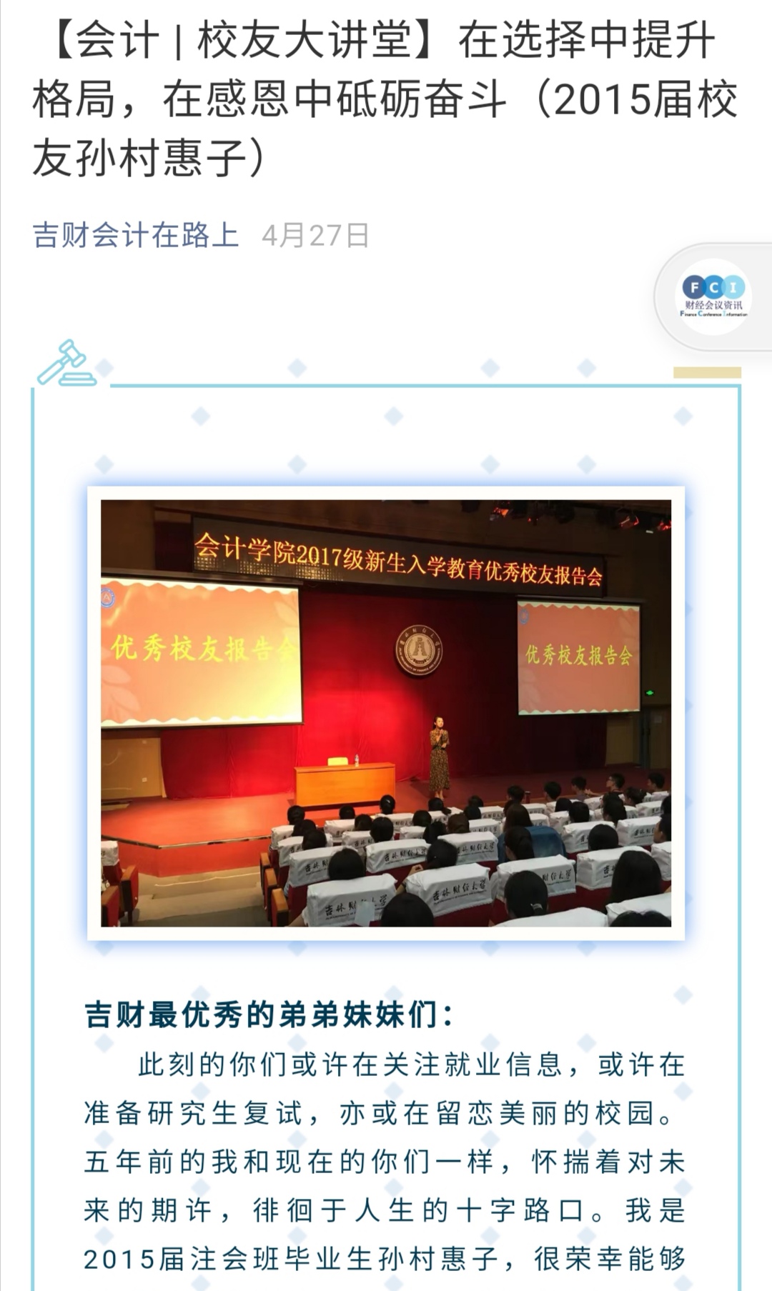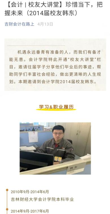此项活动得到了员工的大力支持,78级员工崔少华和88级员工何俊岩分别为活动撰写了寄语。历届优秀员工纷纷撰文向同学们分享就业经历;安徽大学博导05届员工周泽将教授《使劲的努力,平静的接受》;吉林省中行金融部主任10届员工曲东魁《繁花盛,再一程》;中车长春轨道客车股份财务部14届员工韩东《珍惜当下,把握未来》;吉林大学财务处15届员工孙村惠子《在选择中提升格局,在感恩中砥砺奋斗》;华为公司原长春市十佳老员工16届员工李金鹏《春风得意马蹄疾,我辈岂是蓬蒿人》;北京悦读文化传播有限公司创始人16届毕业生柴思宇《我的创业二三事》;华为技术有限公司19届优秀员工李才寓《竹杖芒鞋轻胜马,谁怕?一蓑烟雨任平生》;中国石油天然气集团审计服务中心的16届员工解宏升《求职心得经验分享》;中化集团中国金茂控股集团有限公司17届员工于涵《成长分享与职业规划建议》共10名优秀员工为毕业生就业进行了云指导。