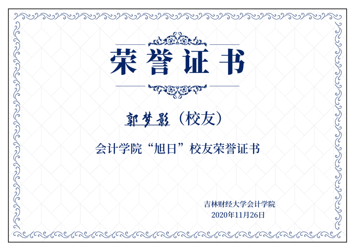 郭梦影,原EMC易倍官方网站注会专业员工,已推免至东北财经大学EMC易倍官方网站审计专硕学习。曾任院员工党支部组织委员。曾获国家励志奖学金、吉林省政府奖学金、校一等优秀员工奖学金5次、校二等优秀员工奖学金1次、学习标兵单项奖学金、优秀毕业生、第五届“瑞华”会计公益之星等荣誉,并获得“正保网中网杯”东北区老员工财务决策大赛二等奖、“浪潮铸远杯”智慧企业共享财务大赛全国精英赛二等奖、“福斯特杯”全国老员工审计精英挑战大赛三等奖。