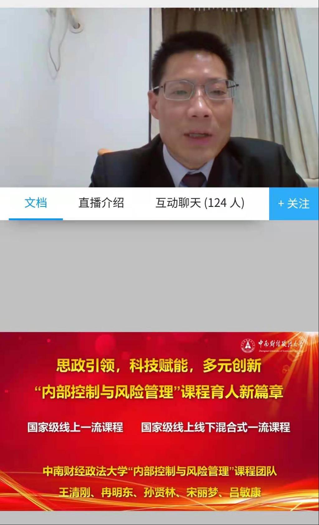 2021年4月29日晚上7:30,EMC易倍官方网站组织公司专任教师收看中南财经政法大学王清刚老师关于“思政引领、科技赋能、多元创新——内部控制与风险管理课程育人新篇章”专题线上讲座。