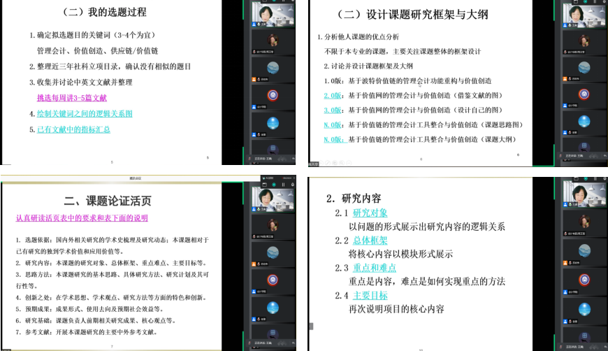 本次学术报告一共分为五个部分,分别是引言部分:了解评审程序及评分、如何进行选题、如何撰写课题论证活页、如何填写项目申请书以及项目申报的注意事项等。首先,王满老师介绍了评审的程序及评分权重,围绕资格审查、匿名通讯初评、会议评审程序、评分的权重这四个方面展开,全面细致的解读了整个评审程序。随后,王满老师就如何选题进行了讲解,王满老师为大家陈列了部分选题原则,包括选题时要紧扣指南,并要以问题为导向,选题的立意在保持新颖的同时要选择较为熟悉的领域,并且标题语要做到精炼。同时,王满老师以个人选题的过程为背景,为大家总结经验与技巧。王满老师指出:在确定拟选的题目的关键词时,以3-4个为宜,同时要整理近三年社科立项的目录,确保没有相似的题目,并且画出框架图代替课题大纲,而非采用图片形式。王满老师提出:就如何撰写课题论证活页部分,一定要认真研读或页表中的要求和表下面的说明。接着,王满老师就选题依据、研究内容、思路方法等方面进行展开式讲解,将每一部分下的逻辑思路和注意要点一一展开,全面细致的讲解了活页的撰写方法。最后,王满老师为与会人员讲解了项目申请书的填写和项目申报的注意事项。