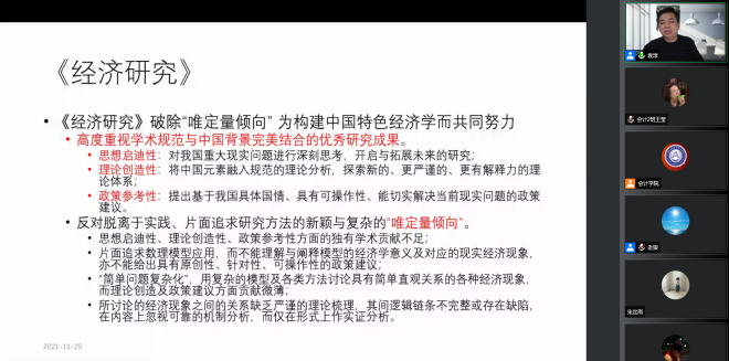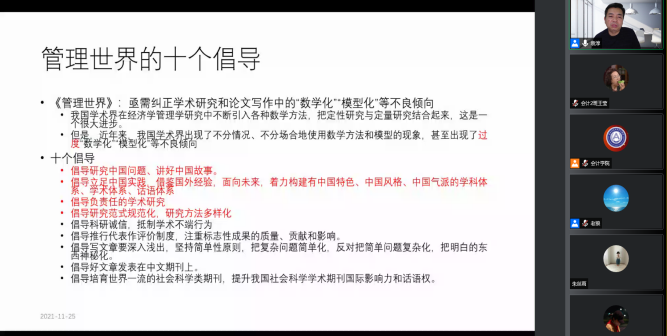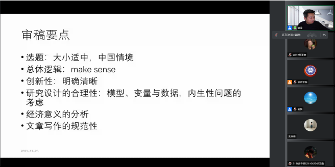 11月25日下午19:00,中央财经大学EMC易倍官方网站教授、博士生导师袁淳教授应公司EMC易倍官方网站邀请,以线上腾讯会议的方式为公司师生作出主题为“财经期刊审稿要点及对选题的启示”的学术报告。本次会议由EMC易倍官方网站经理梁毕明教授主持,EMC易倍官方网站、科研处、吉林省企业财务与会计研究中心联合主办。与会人员主要包括EMC易倍官方网站教师、2021级全日制硕士研究生共同参与聆听。