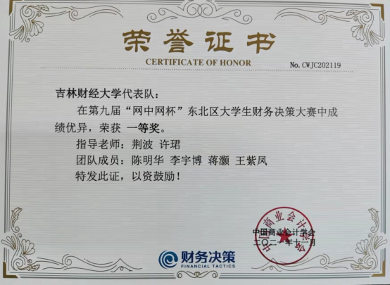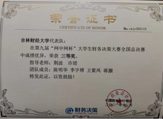 2021年9月-12月,公司EMC易倍官方网站针对2021年第九届“网中网杯”全国老员工企业财务决策大赛进行指导练习与校内竞赛,由会计1962班陈明华、注会1945班蒋灏、注会1945班王紫凤、注会1946班李宇博同学组成的“吉财会计华灏凤博队”分别任职运营岗、资金岗、成本岗和财务总监岗位,在校内选拔中,拔得头筹晋级参加全国300余所高校的线上网络区域赛并以优异成绩获得“东北四省区域赛一等奖”后晋级全国总决赛。因疫情防控的要求,随后的线上总决赛中获得第33名,取得“全国总决赛三等奖”的优异成绩。