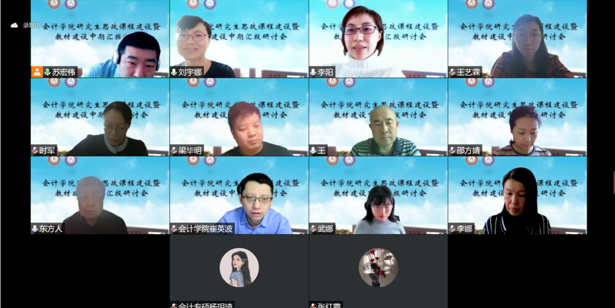 在教材建设方面,崔英波、蒋文春、张红霞、王继红、曹晓雪五位老师分别就研究生课程教材改革立项进度进行汇报。崔英波老师针对《政府与非营利组织会计》教材的编写进程以及未来修订方向进行简要汇报。蒋文春老师主要针对《内部控制理论与实务》教材编写的构思以及案例资料搜集简要汇报。王继红老师在《审计理论与实务》课程教材编写的汇报中重点提出,相比于本科阶段,在编写适用于会计专硕课程的教材更加注重实践应用以及思政内容的渗入。张红霞老师对《财务会计理论与实务》教材编写的汇报表示,本门课程教材主要以授课内容为主,加之相关的案例素材辅助完成。曹晓雪通过对教材编写的设计计划、资料整理、文章完善等方面,简要的针对《商业伦理与会计职业道德》课程的教材编写情况进行汇报。纵观整体汇报情况,各位老师均在规定时间内认真出色的完成了既定立项计划,此次会议圆满结束。