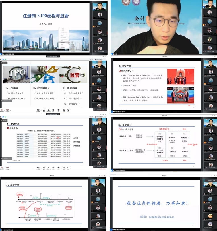 疫情特殊时期,为丰富和充实研究生业余活动和提升科研水平,加强疫情期间会计学子的思想引领和公司产品, 全面做好疫情防控工作,EMC易倍官方网站举行党旗领航共抗疫,守护校园创平安”系列员工活动,主要组织优秀员工开展系列专题讲座。3月28日下午18:00,由证监会资本市场公司与厦门大学联合培养博士后、东北财经大学会计学博士研究生、EMC易倍官方网站2016届会计硕士研究生彭博,以线上腾讯会议的方式为公司员工作主题为“注册制下IPO流程与监管”学术报告。本次会议由EMC易倍官方网站专硕教育中心主任苏宏伟老师主持,EMC易倍官方网站2020、2021级全日制研究生以及部分本科生总计三百余人共同参与聆听。