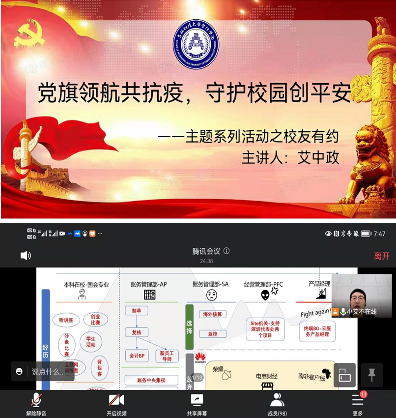 艾中政学长给我们分享了自己大学本科期间的经历,他表示相较于获得的各类奖项和荣誉让自己获益更多的是以下部分:1.听知名员工或业界精英人士的讲座,通过他们开阔的视角,讲述自己成功的经验,自己也深受启发,对在校生思维提升和增长见识都有好处;2.参加各类竞赛活动,例如各类创新创业比赛,参加创业比赛并不意味着一定要去创业,比赛培养的是一种创新创业精神、锻炼思维逻辑能力,考验团队统筹协作的能力,在比赛过程中我们的成长速度是其他的活动所不能比拟的;3.沙盘比赛,以管理人员视角模拟企业运营,熟悉企业财务经营管理流程,培养自己敏锐的商业思维和财经人才专业素养,对于同学们来说尤为重要;4.校内外活动,多参加校内外活动可以结识更多志同道合的伙伴,提早接触社会,拓展自己的人脉资源,充实老员工活;5.背包客,在一个暑假,一个人背着包穷游八、九个城市,住在青旅,遇到了许多有趣的灵魂,听了许多他人的或喜或怒的小故事,也是人生中精彩的一笔。艾中政学长分享了自己的工作经历。2018年毕业通过校招签约华为,被分配到集团财经账务管理部。到2020年H1,连续三个半年度绩效为A(top25%),获得了账务管理部2019年度账务管理部总裁个人奖-优秀潜力员工。后续因在工作中有相关的系统方案建设的经验,结合个人对于自身未来职业发展的定位,转入终端BG业务部门、成为了一名产品经理,目前在努力转型中。学长说:“选择有的时候比努力更为重要,选择适合自己的,喜欢的职业才能更好的在工作中发掘自身的潜力、发挥自己的价值,最重要的更是在工作中重新认识自我、重塑自我,成为自己未来想要成为的样子。当然也要切记评估好自身具备的能力、工作经验和目标之间的差距,跨行业发展背后对应的成本也是很大的,用人部门找人也是有相关经验要求的,要谨慎做出选择,但职场不是短跑,不是吗?”