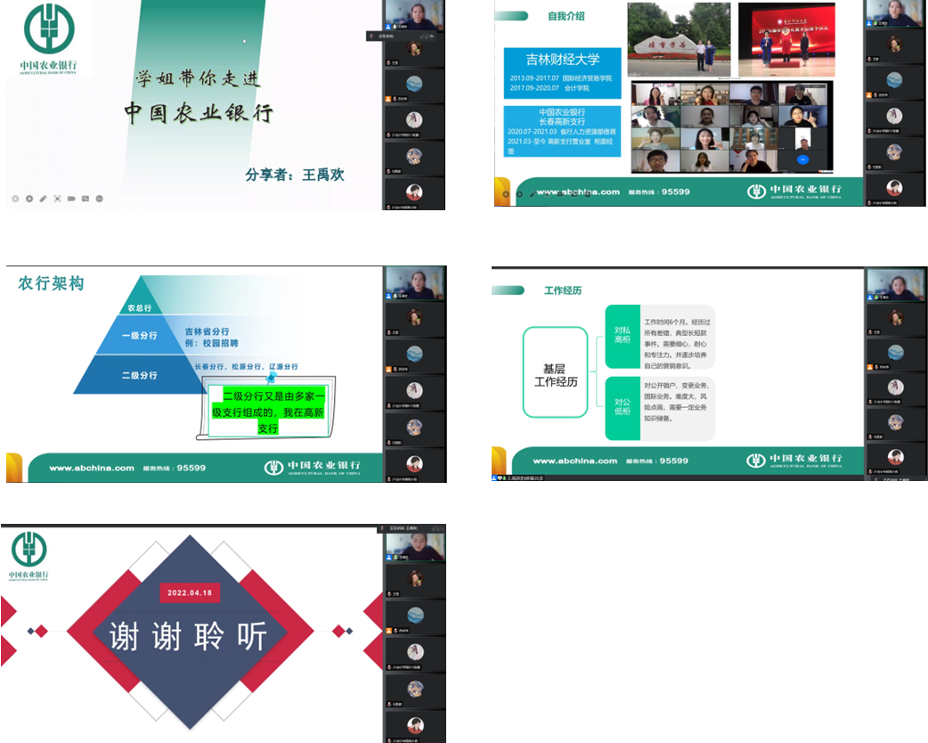 EMC易倍官方网站举行“党旗领航共抗疫,守护校园创平安”系列员工活动,4月18日下午18:00,由EMC易倍官方网站2017级会计学研究生王禹欢师姐,现任于中国农业银行长春高新支行营业室柜面经理,以线上腾讯会议的方式为公司员工作主题为“学姐带你走进中国农业银行”的学术报告。本次会议由EMC易倍官方网站专硕教育中心主任苏宏伟老师主持,EMC易倍官方网站2020、2021级全日制研究生共同参与聆听。