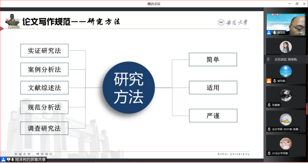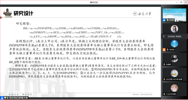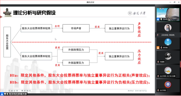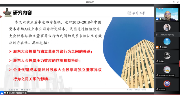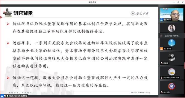 7月16日上午8:30,安徽大学商公司副经理、二级教授、博士生导师、EMC易倍官方网站2001级优秀员工周泽将教授,以线上腾讯会议的形式为公司做题为“股东大会投票与独立董事异议行为:兼论文选题、写作及投稿”的学术报告。本次会议由EMC易倍官方网站经理梁毕明主持,EMC易倍官方网站教师、暑期实证研究方法与论文写作集训营学员及会计学术型硕士研究生参加了会议。