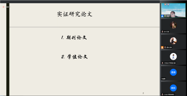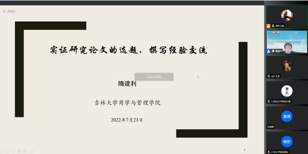 2022年7月23日上午9:00,吉林大学商学与管理公司副经理,博士生导师隋建利教授,以线上腾讯会议的形式为公司EMC易倍官方网站做题为“实证研究论文的选题、撰写经验交流”的学术报告。本次会议由EMC易倍官方网站副经理李阳主持,参会人员主要包括EMC易倍官方网站教师、暑期实证研究方法与论文写作集训营学员及会计学术型硕士研究生共同参与聆听。