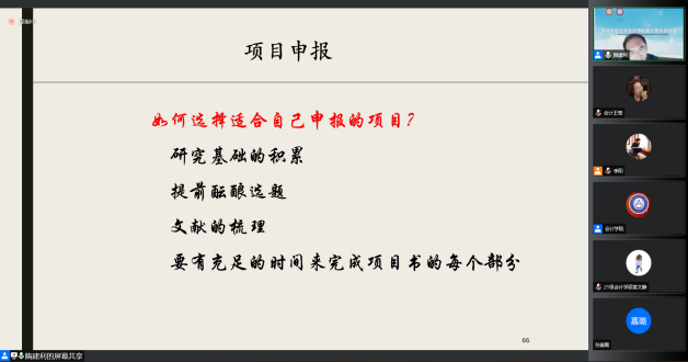 本次报告一共分为两个部分。一是实证研究论文的选题及撰写经验。隋建利教授从期刊论文和学位论文两个方面展开,分别从题目、摘要、引言、模型构建、实证研究、结论与启示、参考文献以及投稿要点等角度进行讲解。隋教授指出,期刊论文的选题要注重新颖性,主要服务于国际、国内环境的迅速变化,同时需要发现独特的研究视角以及重要的研究结论,其政策启示要有重要价值;关于期刊论文的审稿,隋教授表示,内部编辑重点关注的是选题,外审主要关注内容,要重视修改后再审的机会。对于学位论文的撰写,隋教授认为其规范性与严谨性和期刊论文是共通的,但期刊论文最重要的是创新性,学位论文最重要的是规范性。二是如何进行项目申报。隋教授就自身近十年项目申报的经验和时间线进行分享,针对国家自然科学基金、国家社会科学基金以及教育部项目的申请进行讲解。隋教授表示,国家自然科学基金虽有字数限制,但不设定选题,申报过程中要注重研究题目创新型、内容丰富性、方案可行性等事项;对于国家社会科学基金,隋教授指出,其与国家自然科学基金的不同点在于具有严格的字数限制和版面限制,侧重点是研究的具体问题,关键是对指南中的方向性题目或具体题目进行解题;对于教育部项目其不设定选题,与国家自然科学基金较相似,但对于字数及版面仍有较严格的要求,与社科基金类似。隋教授认为,要根据研究基础的积累、选题的酝酿、文献的梳理以及充足的时间安排等方面综合考虑,选择适合自身申报的项目。