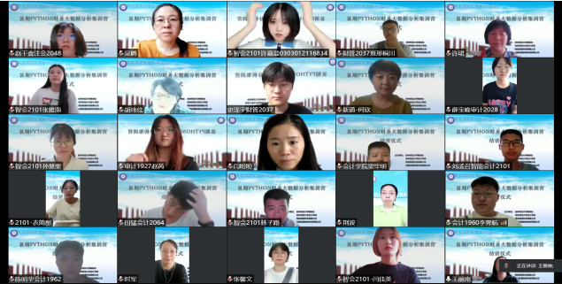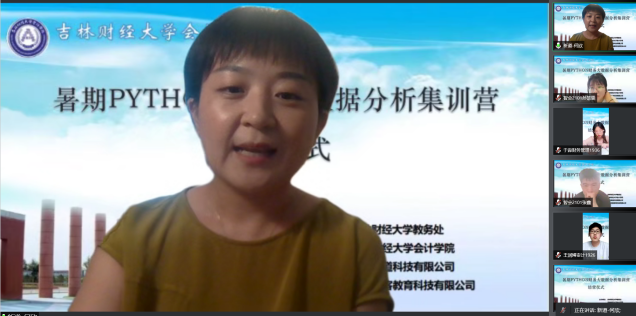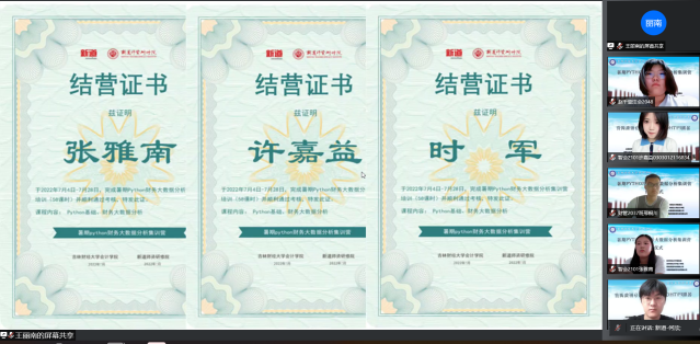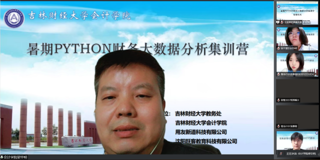 首先,王丽南老师简要总结本次集训营,用友新道科技有限公司和沈阳跃客教育科技有限公司为公司师生提供有深度、有广度的大数据课程,为本次集训营的顺利开展提供巨大的帮助与支持。集训营学员许嘉益同学为集训营学员代表,公司21级智能会计班学员许嘉益,很荣幸能够参加到这次的暑期集训营中来,通过本次的学习,极大提高了我自己的财务大数据分析能力,同时更早的对智能会计学习方向拥有更深刻的理解,在疫情如此严峻的情况下,线上和录课两种形式并存的授课方式极大满足同学的上课需要,暑期集训营活动是公司教育向课堂外的一种延伸,也是推进素质教育进程的重要手段,同时也是我们学习知识锻炼才干的有效途径,相信这次的集训让我们所有学员都收获良多,短短的一个月的时间认识了各位老师,结识了更多可爱的伙伴,这将成为我永久的回忆,也将成为我毕生的财富。集训营学员代表张雅南同学认为,有四方面收获:一是增进了商业知识、数据分析、行业前景方面的理解;二是通过系统深入地学习python财务大数据的知识,进一步拓展眼界,丰富智能财会知识;三是掌握了更多智能财务方面的新理念与本领;四是结识了更多有能力的人,结交了更多的朋友。在这里我们不仅收获了知识本领,还收获了友谊。