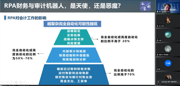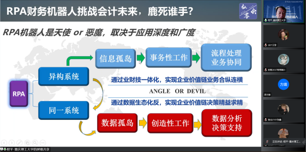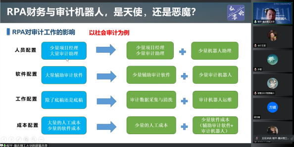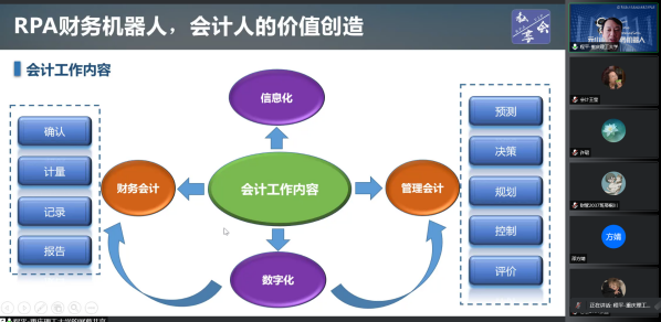 首先,程平教授通过介绍重庆理工大学的教师团队、近年来教育成果、RPA财务机器人课程教学探索历程、相关学术成果以及沙盘推演、案例分析和软件实验等应用场景,引出本次报告主题。程教授认为,财务机器人引发了财务的新变革,表现为RPA对于会计工作的影响、RPA对于审计工作的影响,列举集团企业FSSC中的RPA机器人应用和对RPA的误解和极端认识,并据此指出会计人应该如何应对RPA挑战。接着,程平教授为大家介绍财务机器人的功能以及其为企业带来的主要价值,包括效率与成本、效能与质量以及风险与合规等方面,并运用金蝶软件演示差旅费数据分析和RPA审计机器人工作流程、基本功能、应用场景等。最后,程平教授表明RPA财务机器人的作用取决于应用深度与广度,其可以通过业财技一体化,实现企业价值链业务合纵连横,也可以通过数据生态化反,实现企业价值链决策精益求精。
