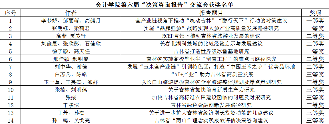 本次交流会共计接收决策咨询报告22篇,通过匿名外审后筛选出14篇决策咨询报告进行交流汇报。经长春市社会科学界联合会刊物编辑部主任李中良、吉林日报社主任记者兼吉林省报告文学委员会秘书长孙翠翠、集团国际经济贸易公司刘兆国教授等评委的现场点评及打分,并综合专家初评分数与现场汇报分数,最终评选出一等奖2名,二等奖5名,三等奖7名。