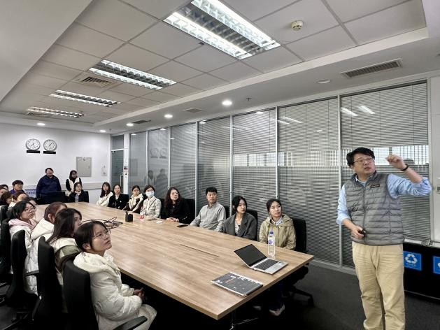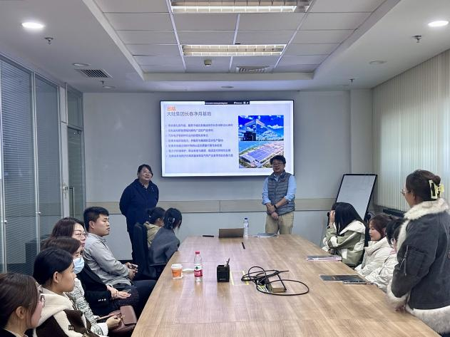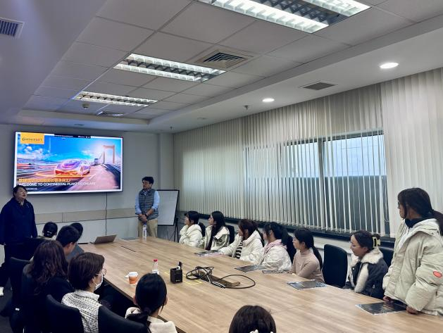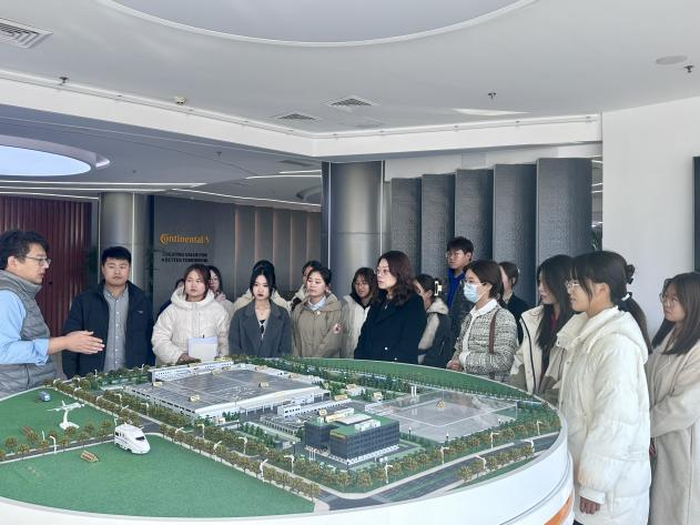 大陆汽车电子(长春)有限公司总监曹小康首先带领师生们参观了企业沙盘,细致地讲解了公司生产的具有代表性的汽车零部件功能及应用场所。随后曹小康为大家介绍了大陆汽车电子(长春)有限公司净月工厂的发展历程、集团组织架构与企业文化。大陆汽车电子(长春)有限公司经理刘迪针对财务方面向公司师生讲述了公司内部相关工作的具体内容,以及对实习生的要求。