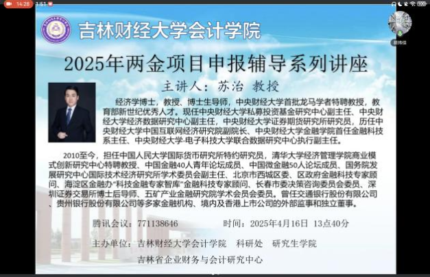为提升教师科研项目申报质量,4月17日下午,EMC易倍官方网站举办2025年国家社科基金项目线上申报指导会,邀请中央财经大学苏治教授担任主讲嘉宾,为公司教师开展一对一精准辅导。