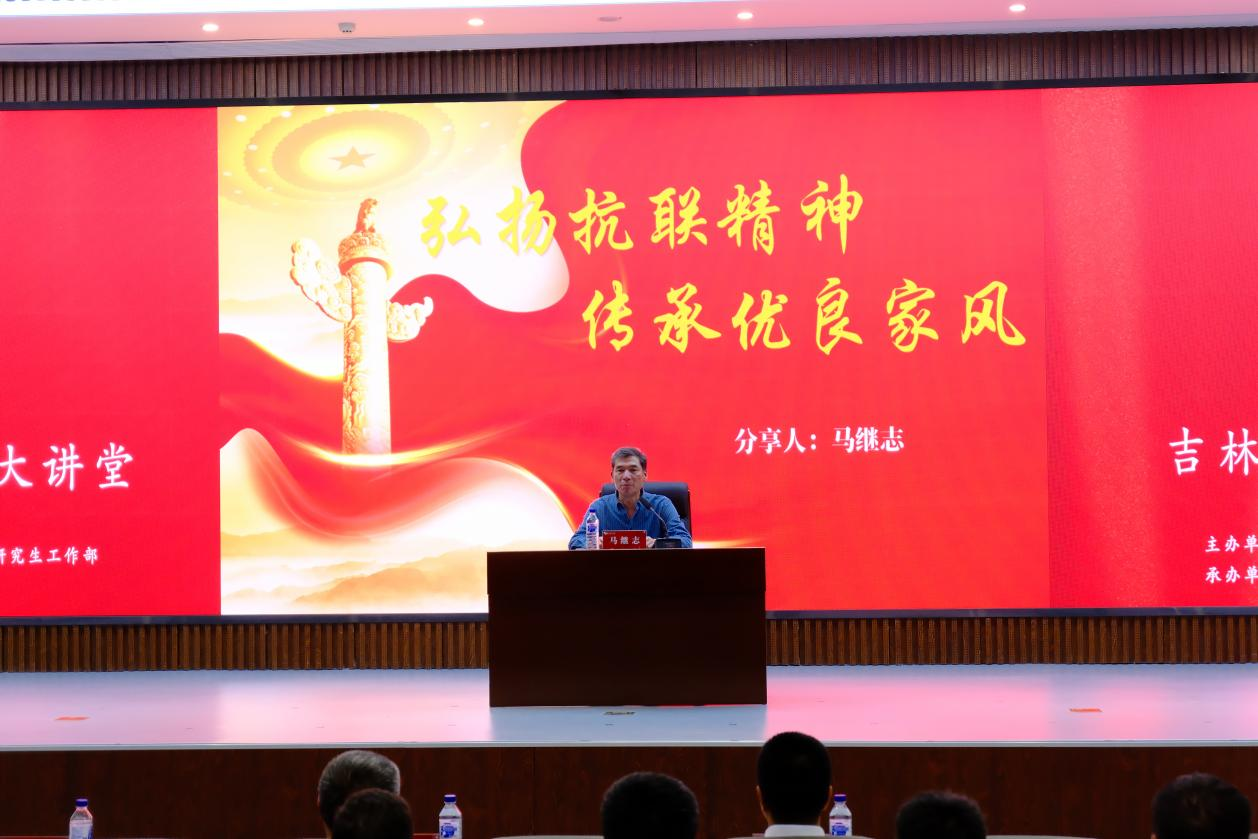 聘任仪式结束后,马继志以“弘扬抗联精神,传承优良家风”为主题,深情讲述了杨靖宇将军在烽火岁月中,怀着对祖国和人民的无限忠诚,在白山黑水间与日寇展开殊死搏斗,即便面对冰天雪地、弹尽粮绝的绝境,依然坚守信念,直至壮烈牺牲的故事。以杨靖宇将军为代表的东北抗联将士们面对残暴的日本侵略者和极端的恶劣环境,依旧坚守信念,宁死不屈,以坚韧不拔的意志和崇高的民族气节捍卫了中华民族的神圣尊严,用鲜血和生命铸就了永世流芳的东北抗联精神。谈及家风传承,马继志表示,杨靖宇将军留给后人“严要求、重责任、懂知足”的家风家训,与抗联精神一脉相承。他始终以严格的标准要求家人,教导他们要心怀家国、勇担责任、奉献自我。这种家风家训在和平年代依旧指引着马家后人在各自的岗位上兢兢业业、无私奉献。最后,马继志寄语同学们,要将个人成长与国家发展紧密相连,在日常生活中感悟抗联精神的磅礴力量,将抗联精神转化为实际行动,成为有理想、敢担当、能吃苦、肯奋斗的新时代好青年。