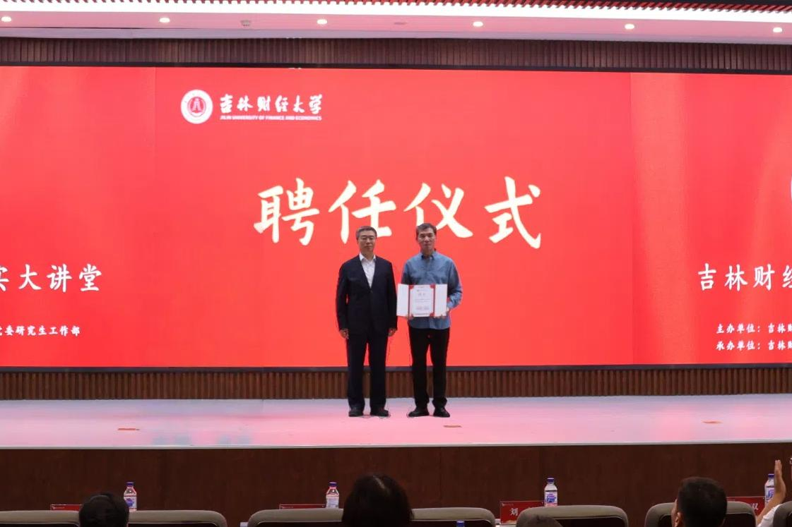 报告会开始前,刘鹤为马继志颁发校外兼职辅导员聘书。