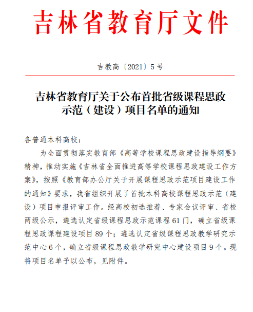 2021年,吉林省教育厅发布了《关于公布首批省级课程思政示范(建设)项目名单的通知》(吉教高〔2021〕5 号)。经省教育厅专家组会议评审,公司有1门课程入选吉林省首批课程思政课程建设项目(具体名单见附件)。