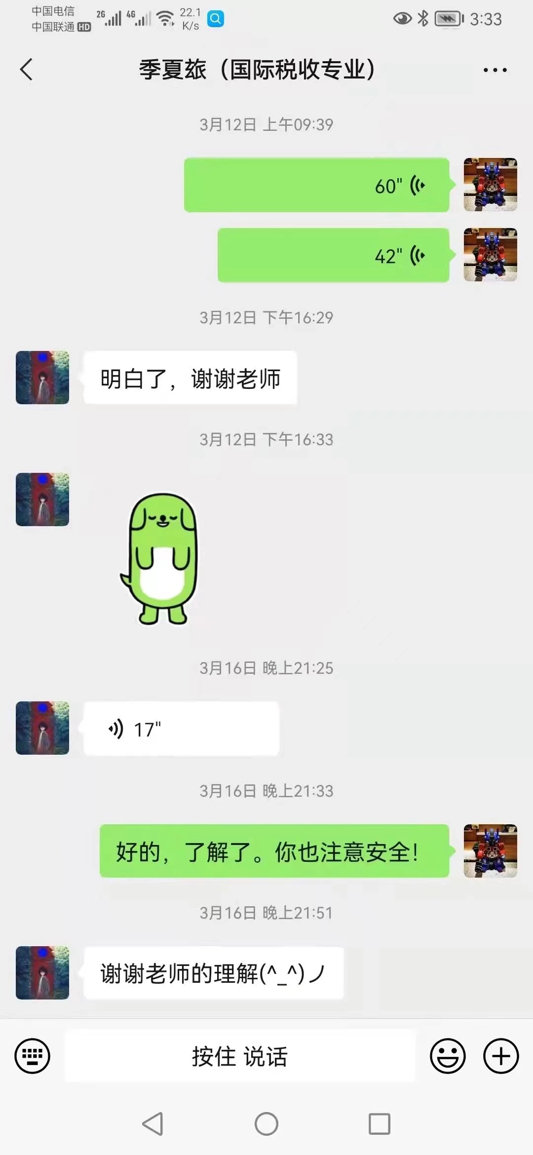 作为一名专任教师,赵老师认为无论面对何种困境,保障高质量的教学效果是人民教师义不容辞的责任,也是教师职业操守的具体体现。考虑到各班防疫志愿者的工作时间可能和上课时间存在冲突,赵老师主动联系各班委,掌握各班防疫志愿者具体名单和工作时间。对于那些确实因防控工作需要缺课的同学,赵老师每周利用个人时间专门为这些同学补课。同时为保证每位同学毕业论文的质量和进度,赵老师有计划地安排针对每一个员工论文的指导,就毕业论文中的具体问题进行线上指导,及时提醒员工参加跨专业实训并随时跟踪校外实训员工的具体进度。