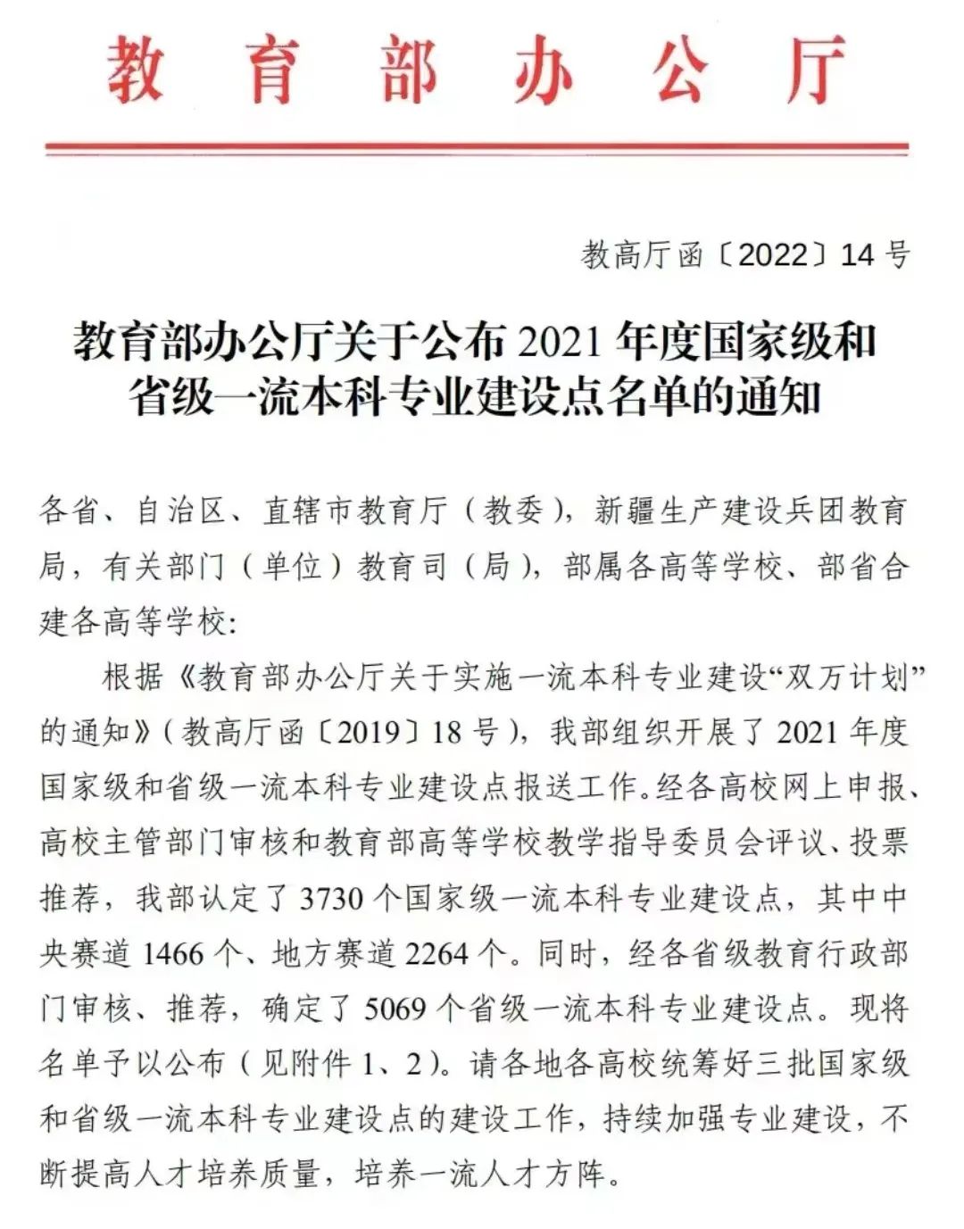 近日,教育部办公厅印发了《教育部办公厅关于公布2021年度国家级和省级一流本科专业建设点名单的通知》(教高厅函〔2022〕14号)公司《审计学》专业入选国家级一流本科专业建设点。迄今为止,公司已有会计学、财务管理、审计学三个国家级一流本科专业建设点。公司将持续加强团队建设,不断夯实基础,以“一流专业”建设发挥引领示范作用,带动公司人才培养能力和质量全面提升